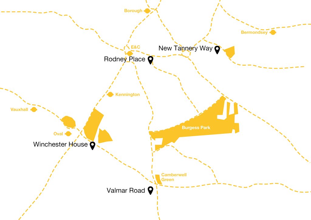 We currently run four studio buildings, all located in South London. They all feature 24/7 access and include communal kitchen areas.